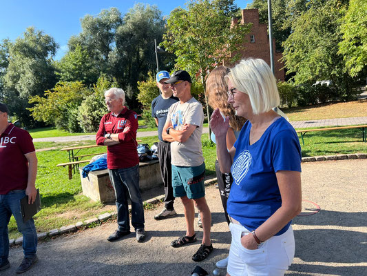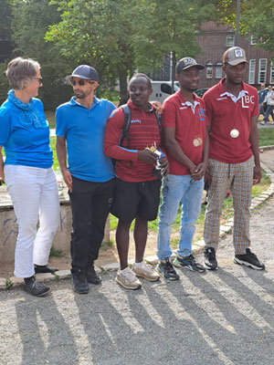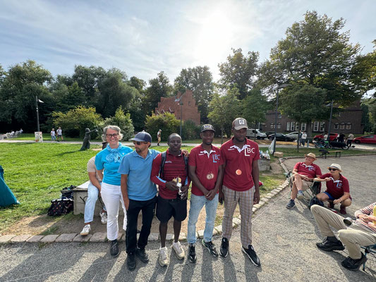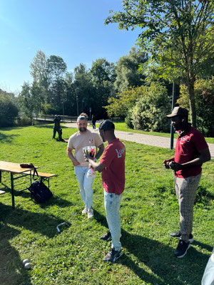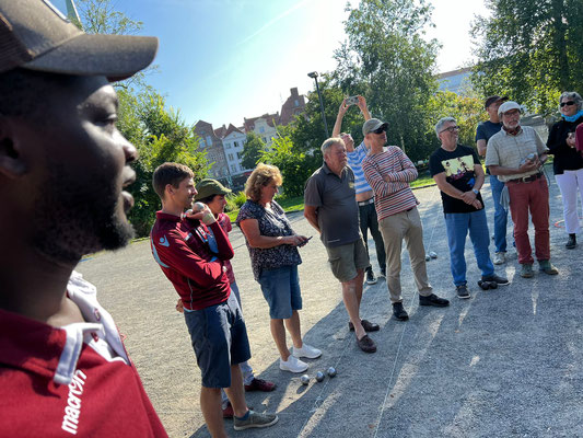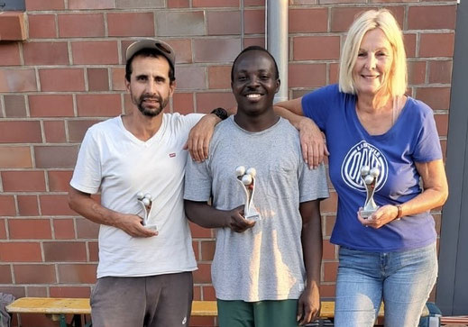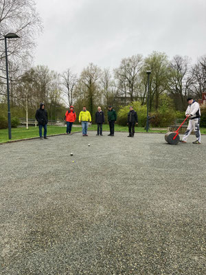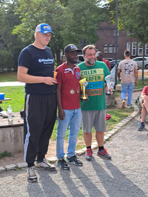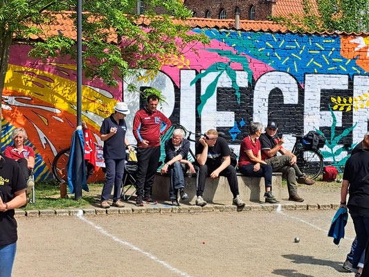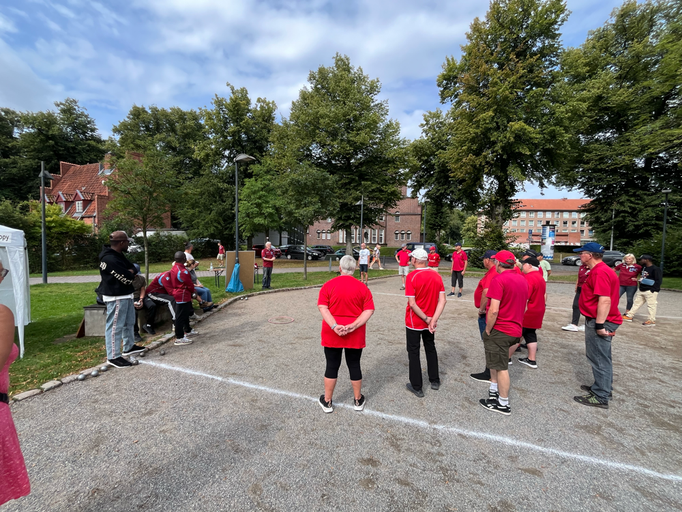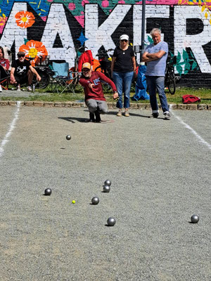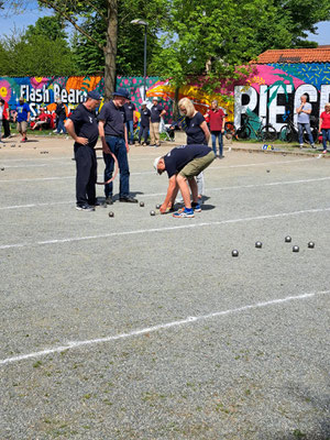 Nachdem Reinhard die jüngsten Erfolge unserer Mannschaften in der Liga gewürdigt und alle begrüßt hatte (u.a. unsere „Starbouler“ aus Hamburg ;-)), ging es endlich los: Vier Runden im Supermelée, davon die meisten als Doublette sowie einige Triplette, sorgten für spannende Begegnungen. Der stimmungsmäßige Höhepunkt mit vielen Zuschauern waren die extra Wettbewerbe: Norbert Lorenz organisierte einen Legewettbewerb, den Jude gewann. Den zweiten Platz belegte Hinrich Kählert vor Oscar auf dem dritten. Nach der Mittagspause führte Michael den Schießwettbewerb durch: Jede/r hatte drei Kugeln, die aus dem 8-Meter-Kreis geworfen wurden (die Senior:innen durften auf 6 Meter vorrücken, wenn sie wollten). Strahlender Sieger war Jude. Die Silbermedaille teilten sich Anja, Ahmed Z. und Mous. Oscar holte Bronze.