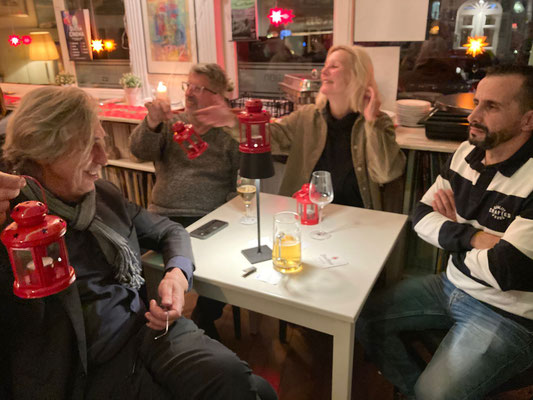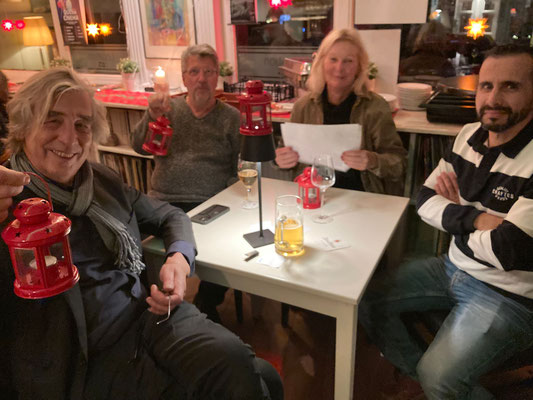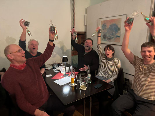 Dann die Ergebnisse: Die rote Laterne erkämpften sich Eddi, Ahmed, Matthias und Stefan K.. Langsam wurde es spannend – dann großer Jubel! Ronja, Jonas, Kai, Sebastian und Udo strahlten; sie waren die Schlauesten und freuten sich über den Siegerpreis: eine Tüte Salzheringe aus Lakritz (in Anlehnung an die Stecknitzfahrer) und eine Flasche Champagner – diese allerdings mehr symbolisch in Form eines Anhängers für den Weihnachtsbaum. Leider hat Reinhard vergessen, die von Anni so schön entworfenen Urkunden zu übergeben. Dies wird selbstverständlich feierlich nachgeholt. Für den phantasievollsten Tischnamen gab es einen kleinen Extrapreis; glänzen konnten Johanna, Hinrich Kählert, Hinrich Kluge, Chris und Martin: Team Spartakus.