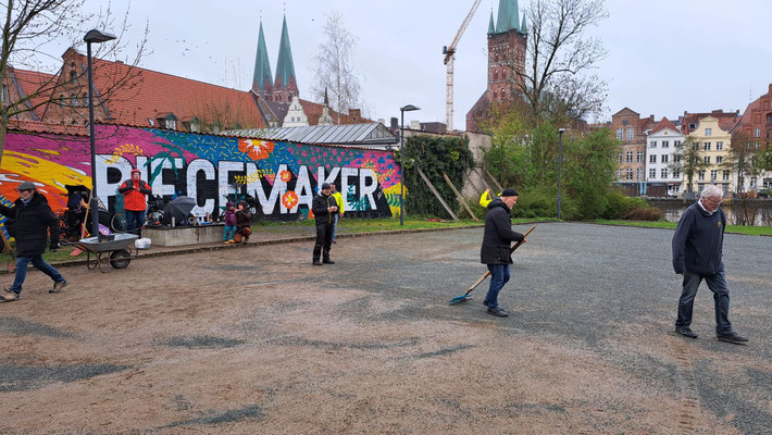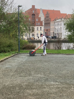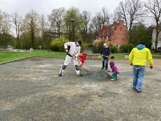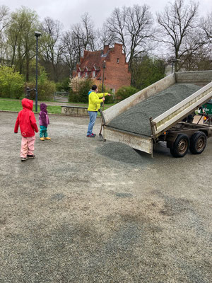 Zum Schluss warteten wir auf die Lieferung des Splits und dann ging es an die Verteilung. Chris konnte es gar nicht abwarten, den Platz anschließend komplett abzuwalzen. Und was wären wir nur ohne unsere "Minijobber" Thea und Nora gewesen, die uns tatkräftig mit Rat und Tat und vor allem viel Spaß unterstützten.