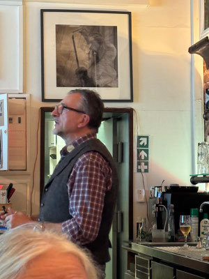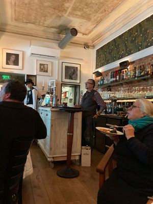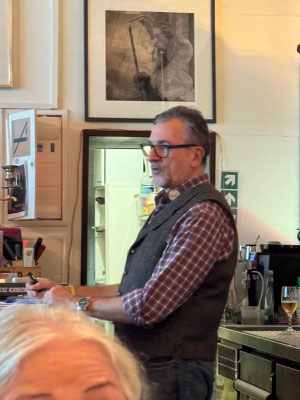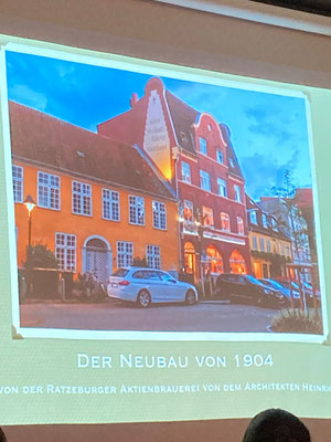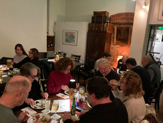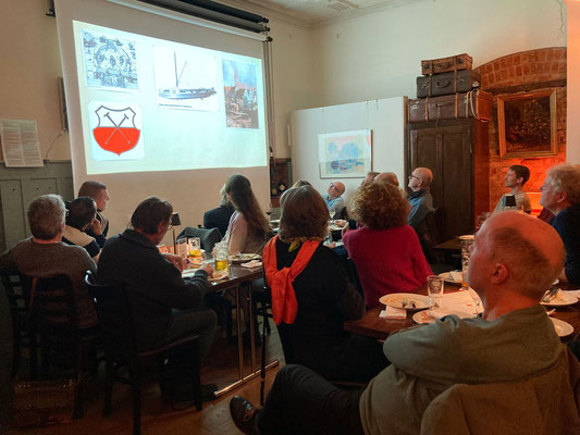 Sage und schreibe 30 Zusagen (nur 3 Absagen aufgrund von Krankheit)! Das hat es noch nie gegeben. Um 18:00 Uhr nahm Tonio alle auf unserem Platz in Empfang, und keiner ahnte, was der weitere Abend noch bieten sollte. Ein kleiner Spaziergang in die Hartengrube, genauer gesagt zum ehemaligen Amtshaus der Stecknitzfahrer, jetzt Location 25. Reinhard empfing uns in den gemütlichen historischen Räumen, zusammen mit Wolf Tourne, dem Inhaber. Das Vorspeisen-Buffet von Gianni war bereits aufgebaut, und die Getränkewünsche wurden charmant an den Tisch gebracht von unserer „Servicekraft“ Eddi. Wolf gab uns einen überaus interessanten, reich bebilderten Einblick in die Geschichte der Stecknitzfahrer und des Amtshauses.