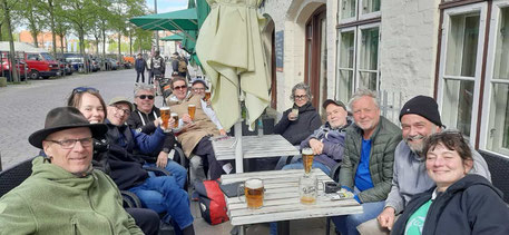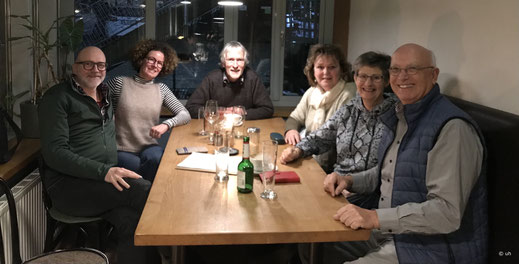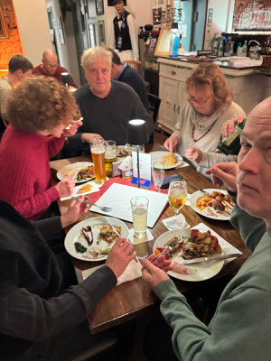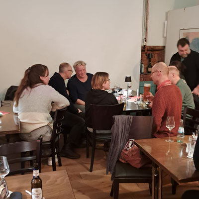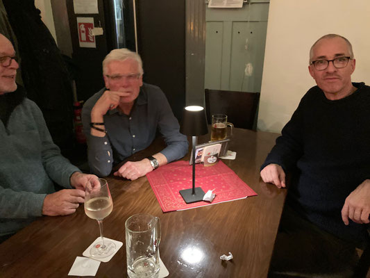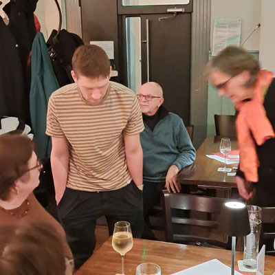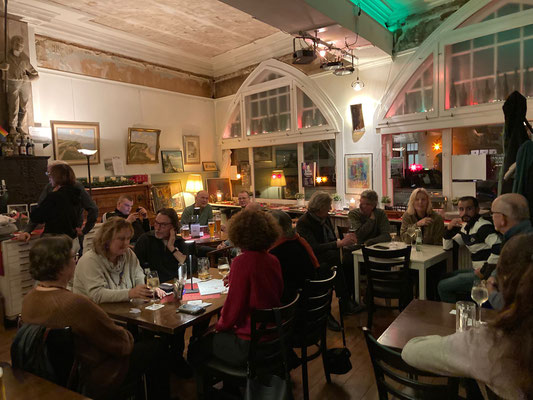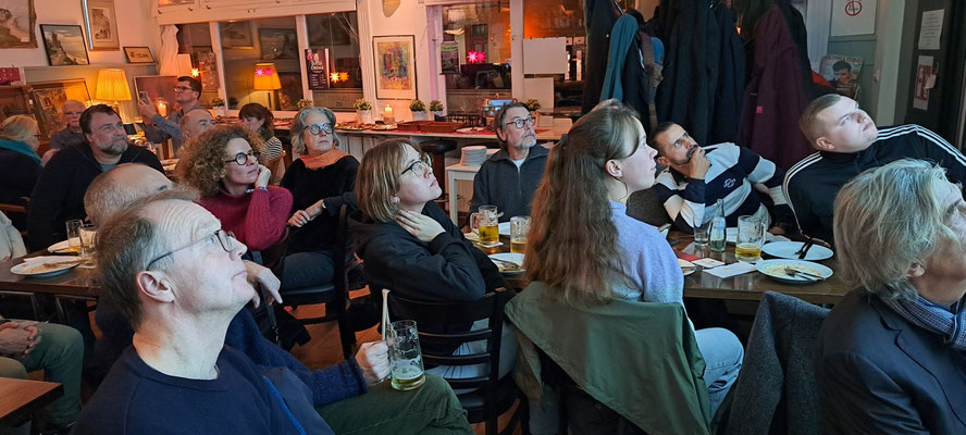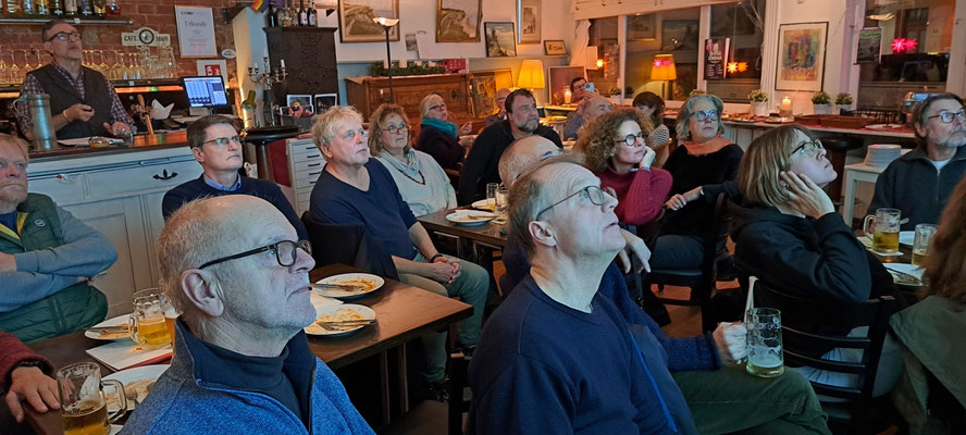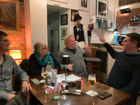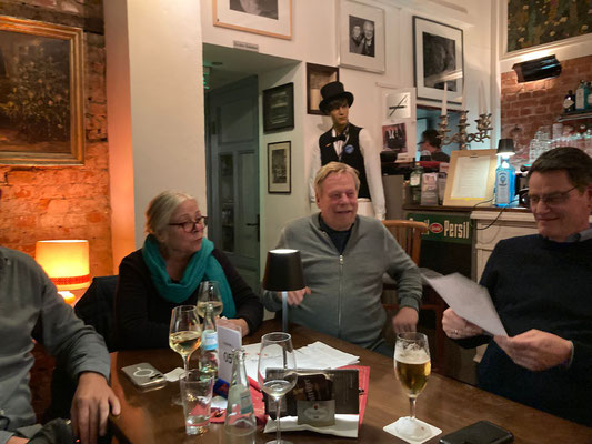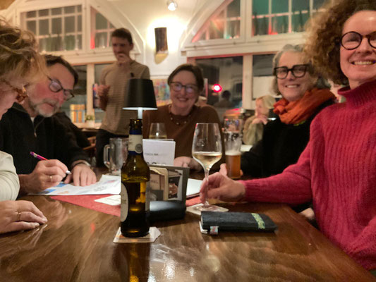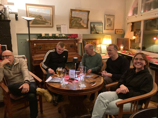 Dann hieß es Platzwechsel. Es sollten für das jetzt folgende Kneipenquiz sechs Tischteams gebildet werden, die sich per Los fanden. Gaby, die schon längere Zeit solche Quizveranstaltungen durchführt, hatte vier Fragenblöcke à sechs Fragen unterschiedlichster Kategorien vorbereitet, dazu ein Bilderrätsel. Man konnte sich nur über plötzlich auftauchende Wissenslücken oder Blackouts wundern. Jedenfalls wurde viel diskutiert, gelacht und auch schon mal hämisch gelästert.