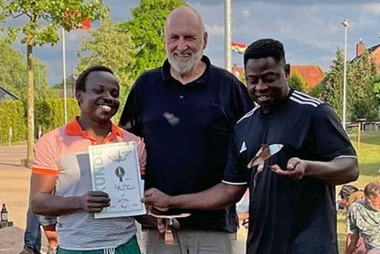 Jude Amia und Malik Abdoul konnten ihre Begeisterung nicht verbergen, als Turnierleiter Michael Meyer ihnen kleine "Fischerkönig"-Figuren, eine Urkunde und das Preisgeld für den ersten Platz beim Elbe-Cup 2024 überreichte. An dem Doublette-Tag nahmen ebenfalls etwa 60 Teams teil.