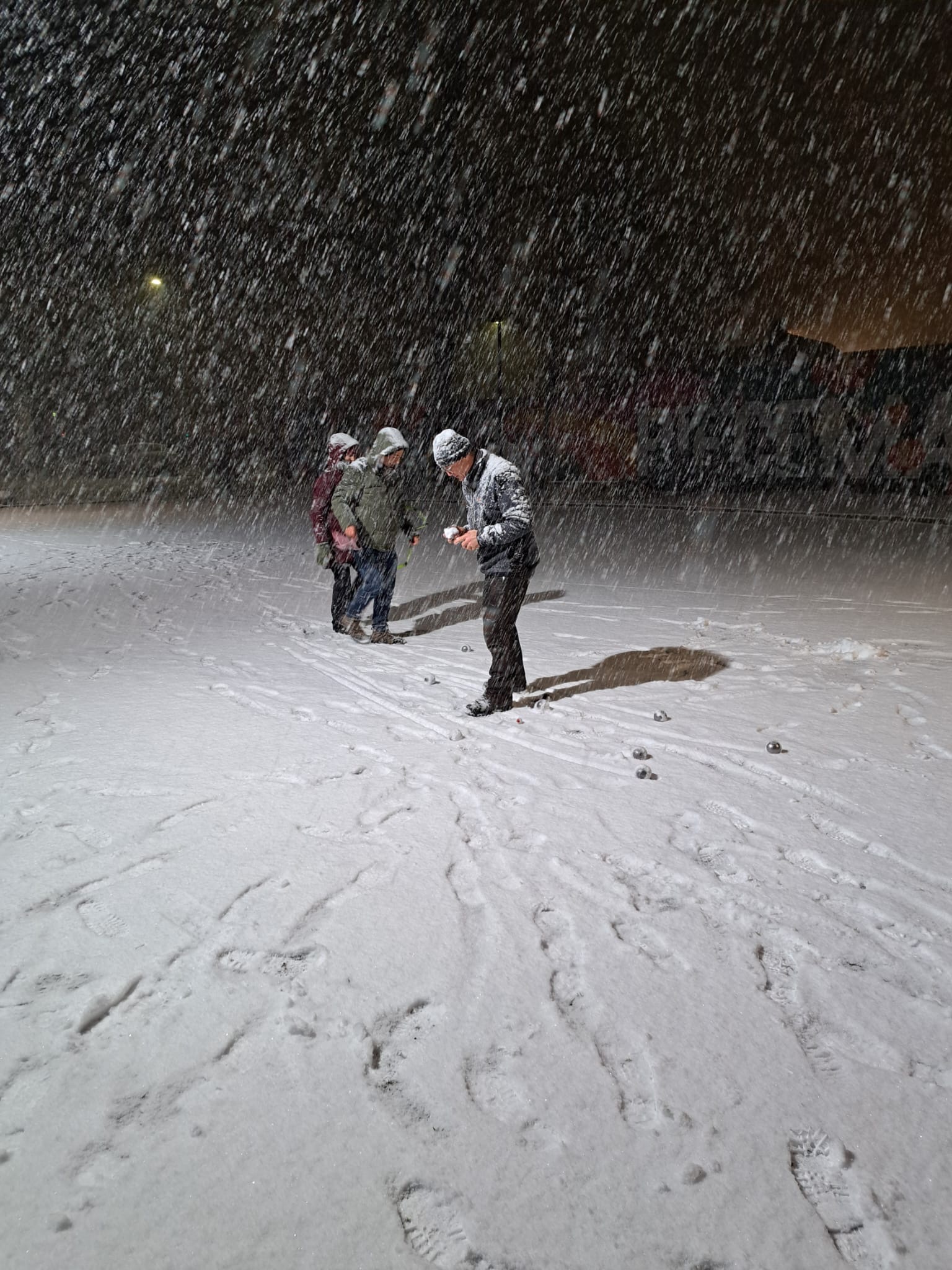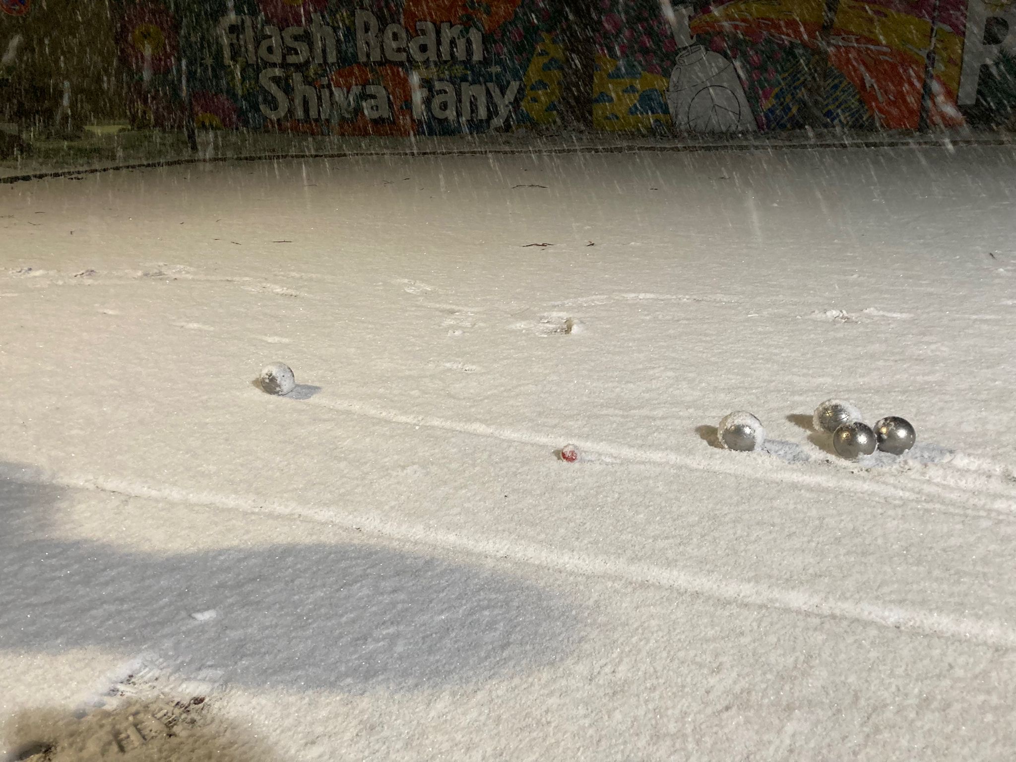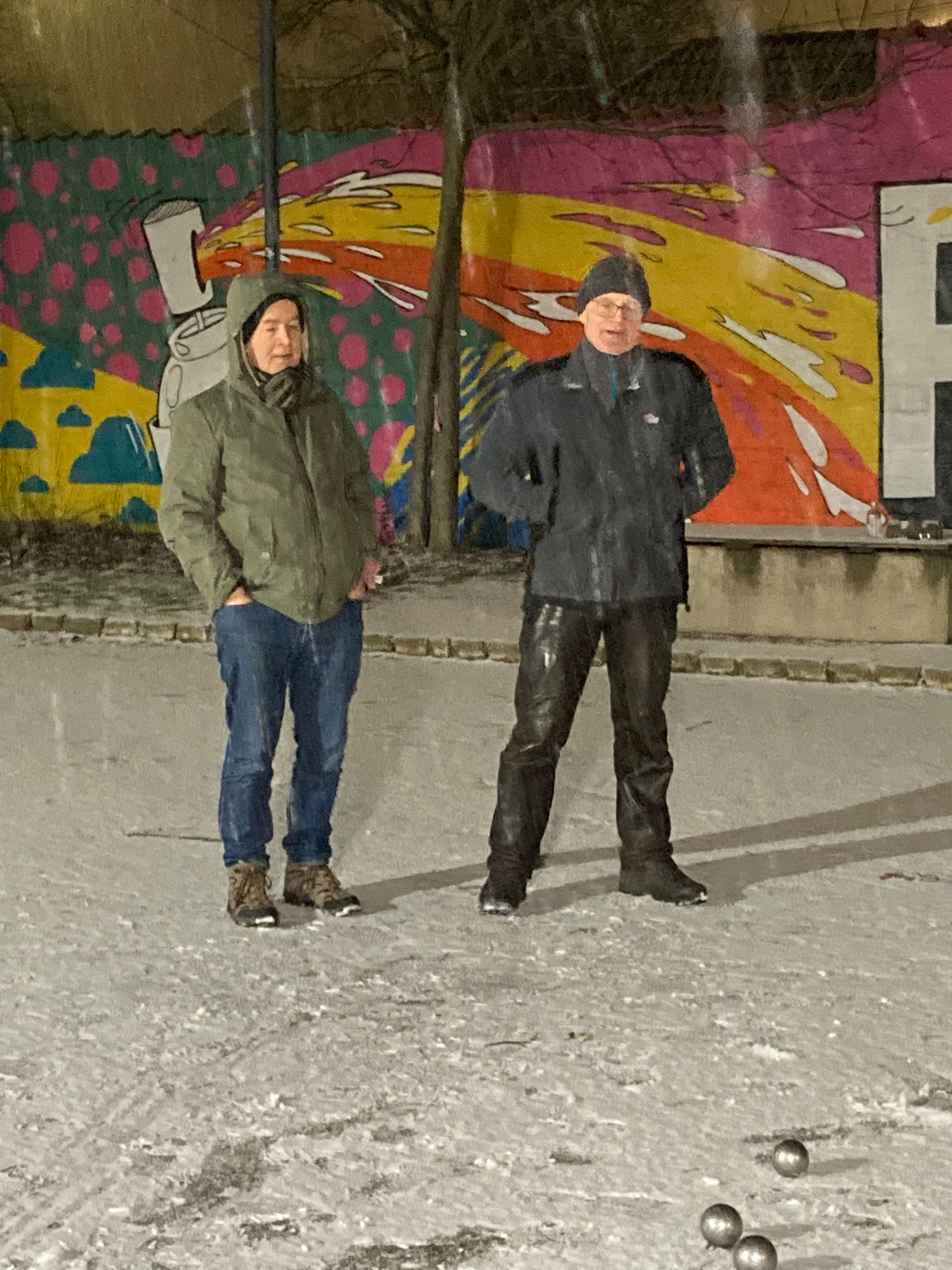 An einem kalten Winterabend war der Bouleplatz mit einer dünnen Schneeschicht bedeckt. Die Laternen tauchten die Umgebung in warmes Licht und ließen den Schnee glitzern. Trotz des Wetters spielten Nele, Hinrich, Hinrich, Frieder, Ronja und Chris drei Runden Boule und genossen die besondere Herausforderung, die der Schnee mit sich brachte. Es war ein unvergesslicher Abend im Schnee auf dem Bouleplatz. Die Vorbereitung für die Bewerbung auf die Winter-Olympia mit Boule als neue Disziplin ist bereits in Arbeit.